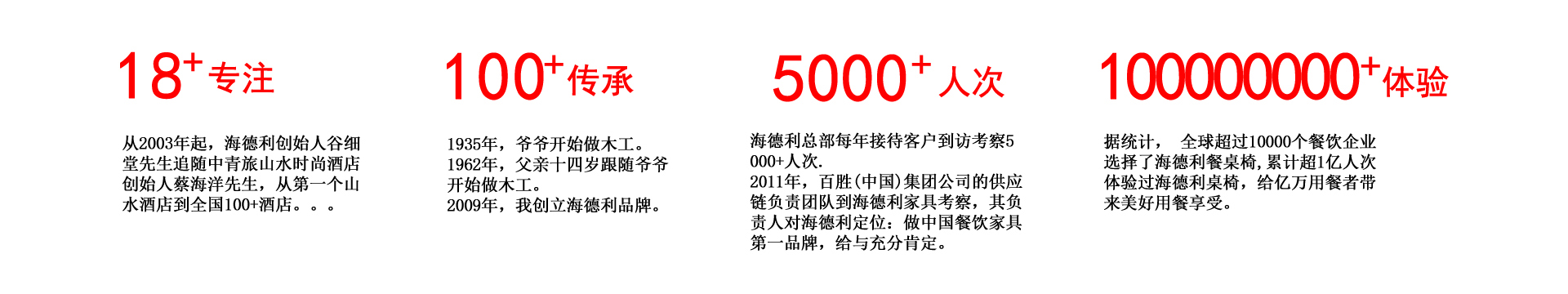 從歐美發(fā)達(dá)市場(chǎng)到東南亞乃至非洲等新興市場(chǎng),超過(guò)100000個(gè)餐飲品牌及餐飲連鎖店,都在使用海德利家具,給您信心保證。